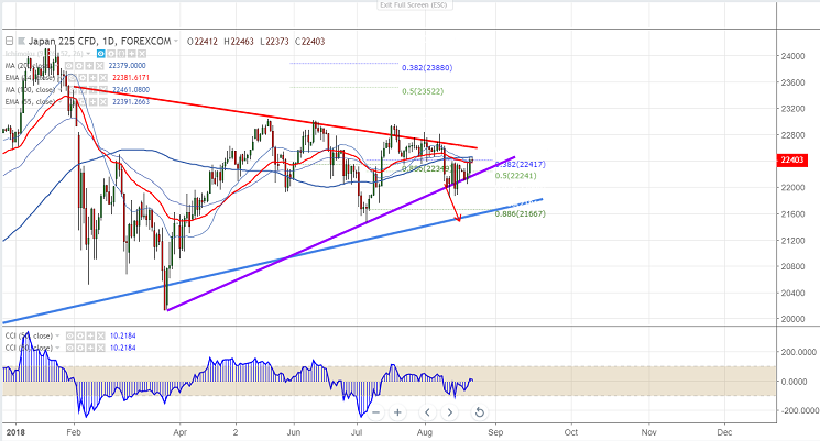 Asian markets are trading mixed as US and China resumes trade talks . US new round of trade tariff of $16 billion on Chinese will take effect at 12:01 am New york.US fed minutes meeting shows that central bank are optimistic on US growth and poised for more rate hikes. US dollar has halted its weakness after hawkish fed comments. US markets closed higher with Dow Jones 25733 (0.34% lower) and S&P500 2862 (0.04% higher). Shanghai is trading slightly higher after hitting low of 2700 and is currently trading around 2732 (0.61% higher). US futures is trading higher with Dow Jones at 25702 (0.11% lower) and S&P500 2857 (0.06% lower). Nikkei is currently trading around 22345 0.57% higher.