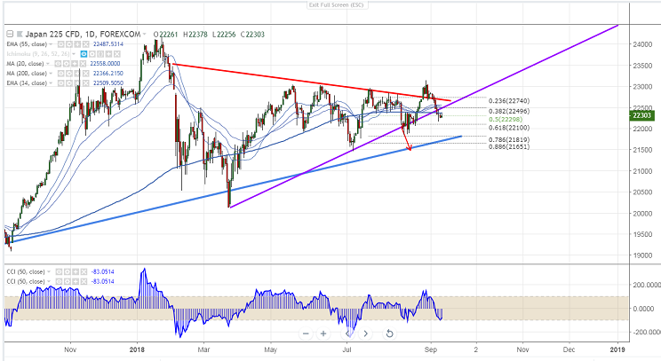 Asian markets are trading slightly lower on first day of trading week on account of escalating trade tensions between US and China.US President Donald Trump has said that US is planning to impose additional tariffs of $267 billion on Chinese goods. But better than expected Japan’s GDP data has supported Nikkei index. Japan’s second quarter GDP came at 3% compared to forecast of 2.6%.US markets has closed mixed with Dow Jones 25916 (0.31% lower) and S&P500 2871 (0.22% lower) and NASDAQ 7902 (0.26% lower). US futures are currently trading slightly lower with Dow Jones 25989 (0.21% higher) and S&P500 2879 (0.24% higher). Nikkei is trading around 22341 (0.35% higher).
