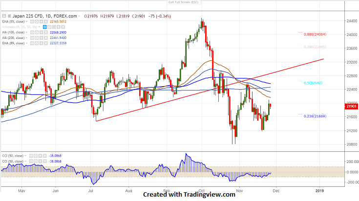 Asian markets is trading mixed especially Nikkei trading flat. US markets has closed well above 1% after sell-off in previous week. Asian markets are struggling to rebound as US President is planning to impose further tariffs on $200 billion in Chinese imports to 25% from 10%. Markets eye US President Trump and Chinese PM meeting to happen in Buneos Aires later this week. Chinese market Shanghai is consolidating after a more than 2.5% sell-off. It is currently trading around 2580 0.20% higher.Nikkei is trading slightly lower and declined nearly 200 points from high of 22089. It is currently trading around 21889 (0.45% lower).