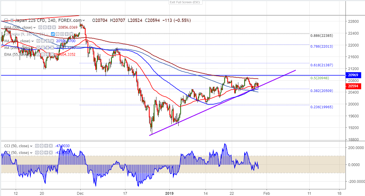 Asian markets are trading weak especially Nikkei declined more than 0.50% on mixed earnings from Wall Street. Xerox and 3M rose after better than expected earnings. Apple posted decent set of numbers and disclosed waning demand for iPhones.US markets has closed weak with Dow Jones 24580 (0.21% higher) and S&P500 2640 (0.15% lower). US and China’s major phase of negotiations to happen this week.Chinese Shanghai composite has recovered more than 1.5% from low of 2559 on trade deal hope and is currently trading around 2596 (0.09% higher). Markets eye US Fed meeting for further direction. USDJPY has once again declined after hitting high of 109.95 and any break above 110 confirms further bullishness.It is currently trading around 109.21.