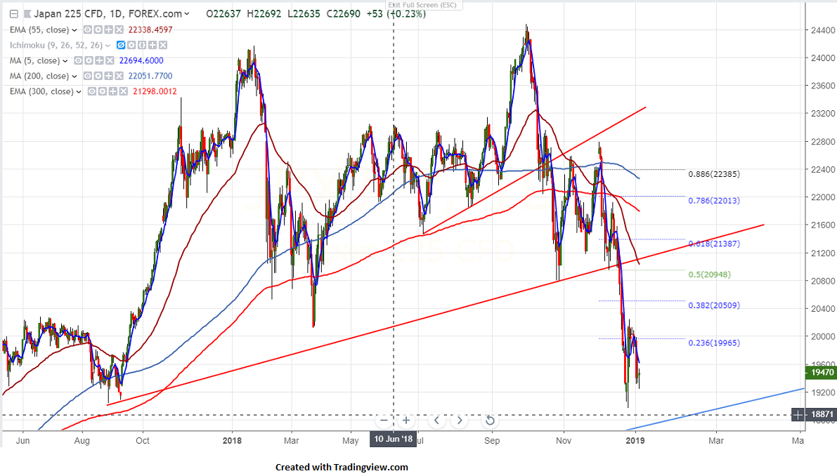 Asian markets are trading weak but recovered from today’s low on slight jump in yen. US markets closed more than 2.5% with Dow Jones at 22686 (2.83% lower) and S&P500 at 2447 (2.48% lower).The yen recovered more than 350 pips after hitting 104.65 lowest level since Mar 2018. US manufacturing PMI came at 53.8 in December down from 55.3 in Nov which has increased growth concerns in US. Shanghai is trading higher and is currently trading around 2509 (1.8% higher). Nikkei is trading slightly higher and currently trading around 19490 (0.22% higher).