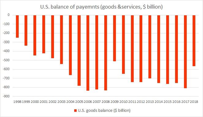 In August, the United States’ goods trade deficit hit the widest on record of $75.46 billion and in 2018, it has already reached $565.6 billion. At this pace, the United States would record the widest trade deficit ever. The deficit is projected between $840-850 billion.