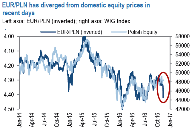 We are neutral PLN but note that EURPLN has strongly diverged from domestic equity prices in recent days (see above chart).