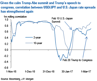 One important assumption of our bearishness on USDJPY is that a correlation between the pair and U.S.-Japan yield spread collapses with heightening concerns on political risks. Although it was the case early this year, the correlation has strengthened again as the U.S.-Japan summit and Trump’s speech to Congress passed without any troubles (refer above chart).