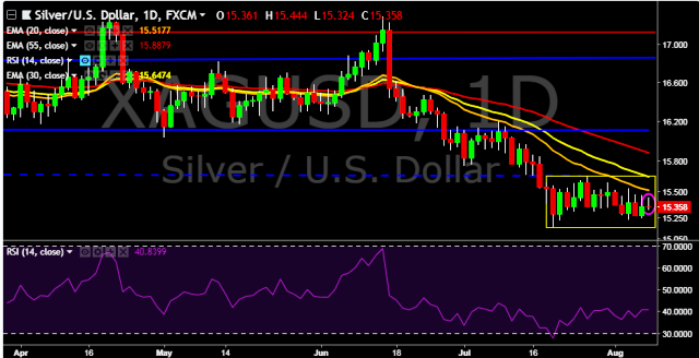 We prefer to take long position on XAG/USD around $15.35, stop loss $15.28 and target of $15.52.