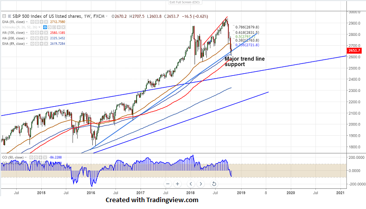 S&P500 declined slightly below 2618 (89 W EMA) and shown a good recovery. The index hits low of 2603 and jumped more than 60 points . The index has not closed below major trend line joining 1802 and 2032 . Any weekly close below confirms major trend reversal. It is trading at 2650 (0.38% higher).