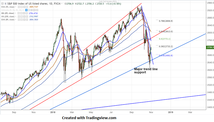S&P500 is trading higher for third consecutive day and jumped more than 130 points from low of 2603. In the past one week index hits high of 2723 on 25th Oct ,2707 (Oct 29th 2018) and after a long consolidation index has broken 2723 and jumped till 2737. It is currently trading at 2718 (0.44% higher).