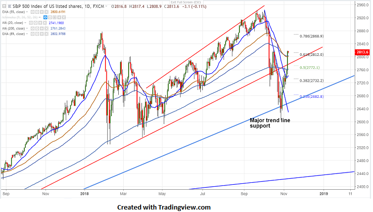 S&P500 has shown a huge jump of more than 2.5% from yesterday’s low and recovered more than 8% from low of 2603. The index has closed well above 200- day MA and this confirms minor bullishness and any break above 2821 confirms bullish continuation. It is currently trading at 2812 (0.14% lower).