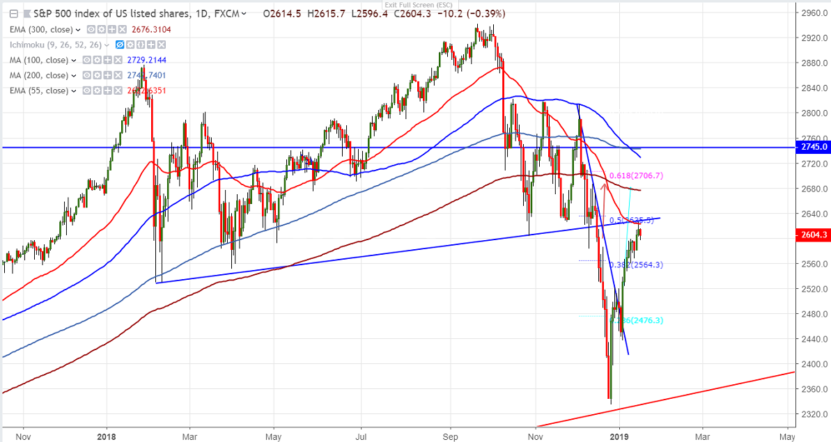 S&P500 has halted its upside movement after 8 days of continuous buying. The index jumped nearly 200 points for the low of 2437. The index hits high of 2623 and is currently trading around 2604.6.