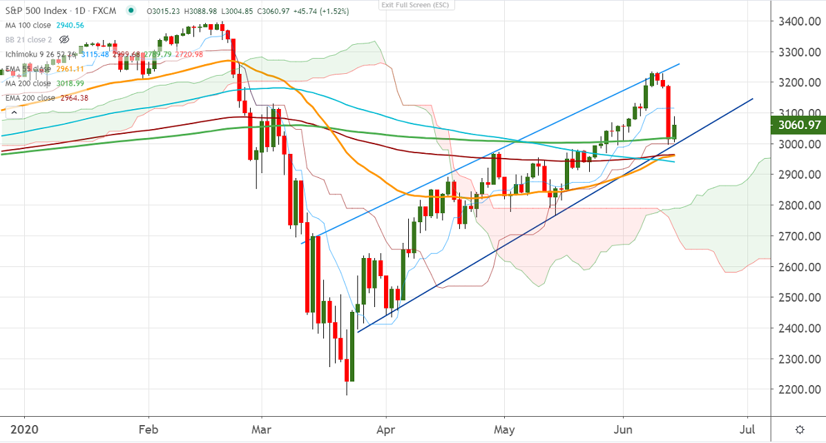 S&P500 halted its 3 days of losing streak and gained more than 60 points. The surge in the number of new cases in the U.S and slight negative comments from Fed officials has dragged the global stock market. The index showed a massive sell-off of more than 6% yesterday and hits low of 2997. It has formed a temporary top around 3233 and is currently trading around 3035.1.