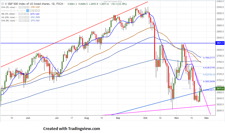 S&P500 is trading higher for second consecutive day and jumped more than 50 points from the low of 2626. The index has lost more than 100 points in previous week after hitting high of 2747. It is currently trading around 2671.8. The index dip was mainly led by energy due to huge selling in crude oil prices.