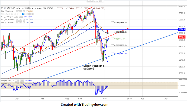 S&P500 has declined almost more than 50 points after forming a double top around 2820.The index hits a low of 2763 and shown a minor jump . S&P500 has jumped more than 8% from low of 2603. The index has taken support near 200- day MA and any break below targets further weakness.It is currently trading at 2776 (0.06% lower).