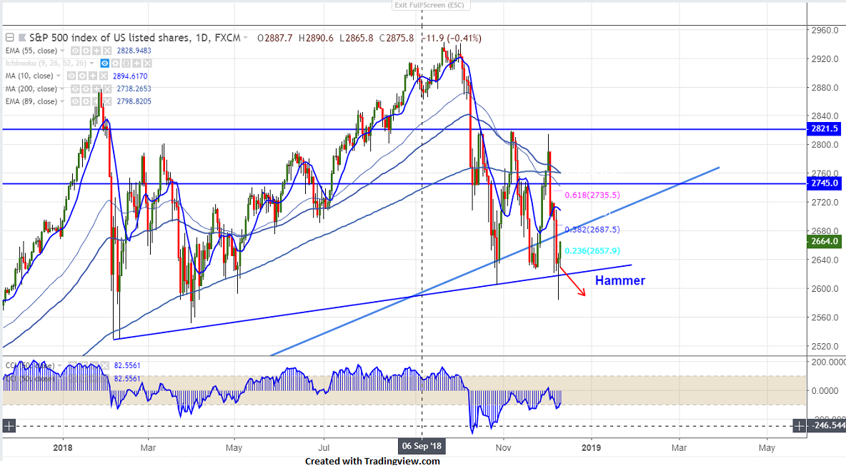 S&P500 has recovered more than 3% from low of 2588 level made yesterday.The index has lost more than 200 points from high of 2813 made on Dec 3rd 2018. The decline was mainly due to declining US bond yield and yield curve inversion. S&P500 hits intraday high of 2665 and is currently trading around 2662.70.