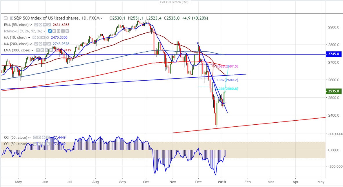 S&P500 trades higher for second consecutive day and jumped more than 100 points in two trading session. The index hits intraday high of 2551 and is currently trading around 2533.
