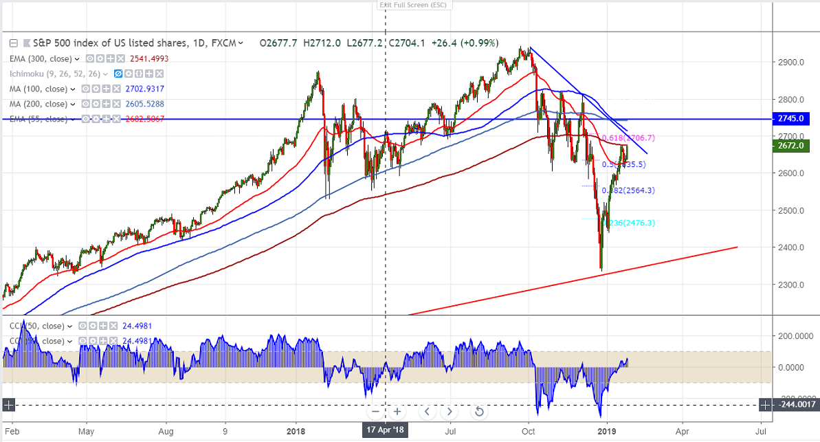 S&P500 has recovered more than 1% after a minor 3 days of selling. The index was closed higher for 5th consecutive week on account of US -China trade optimism. Wall Stret surges on upbeat earnings and US senate is finding ways to end 35th day of government shutdown.The index has jumped more than 14% from low of 2334.It is currently trading around 2668.