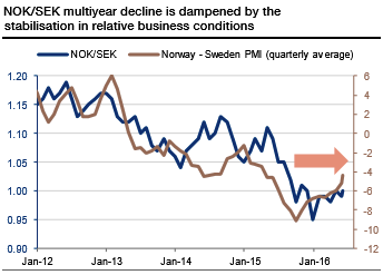 The NOKSEK has been actually driven by relative business conditions in Sweden and Norway and the differential is now clearly stabilizing (see graph).