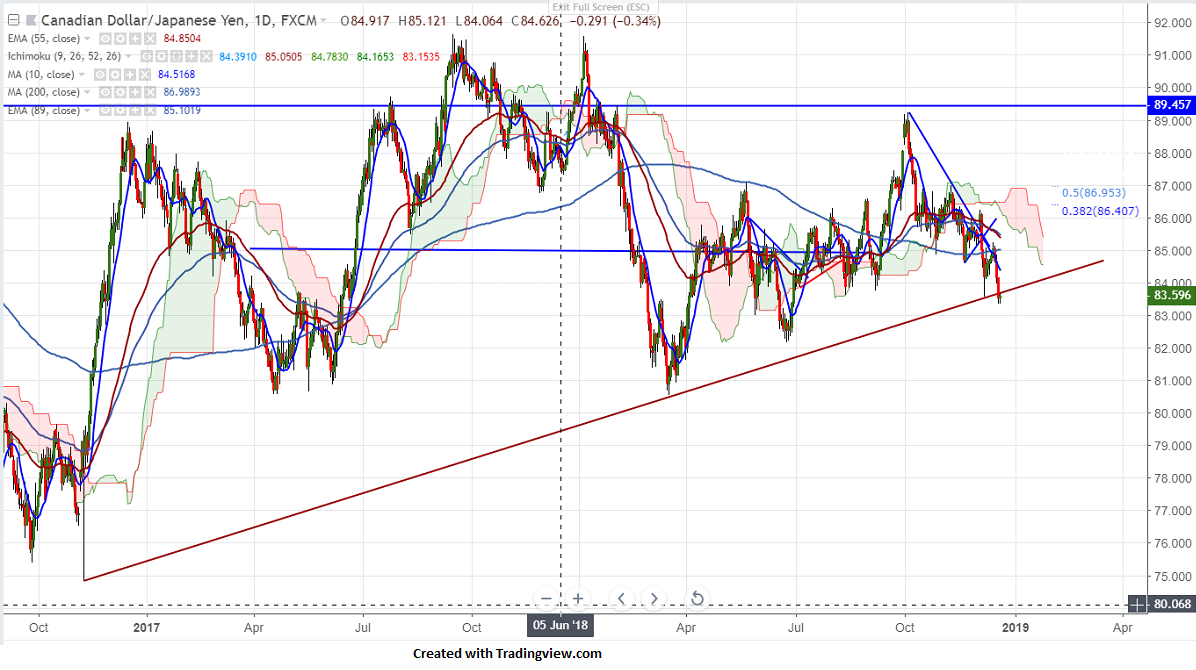 CADJPY is trading weak for past 2 weeks and lost more than 550 pips from high of 89.17 made on Oct 1st 2018. The pair was trading weak on account of weakness in Canadian dollar due to weak crude oil price. The pair hits low 83.35 and is currently trading around 83.56.