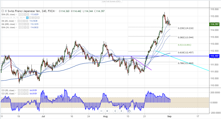 CHFJPY has halted its 2-weeks continuous bullishness. The pair jumped more than 400 pips from the low of 110.83 and hits high of 115.29. It is currently trading around 114.36.