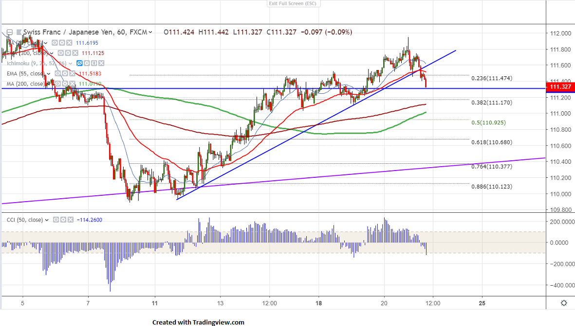 The near term minor support is around 111.30 and any break below will take the pair to next level till 111 (200-H MA)/110.68 (61.8% fib).