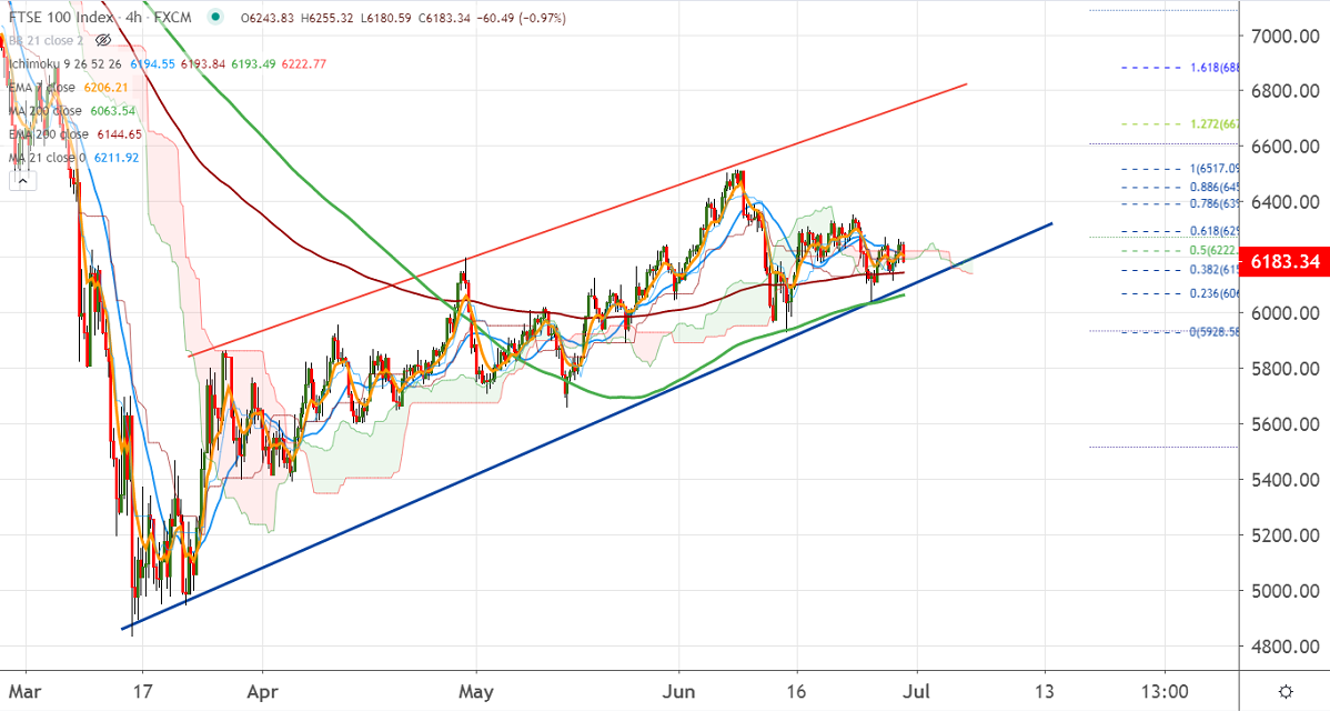 FTSE100 is trading lower after a minor jump to 6262 levels. The weak UK GDP data came yesterday has dragged UK index further down. According to the office for National Statistics (ONS), the economy dropped by 2.2%, the biggest decline since 1979. The increase in the number of new cases in the U.S and the fresh lockdown has decreased demand for riskier assets. It is currently trading around 6.