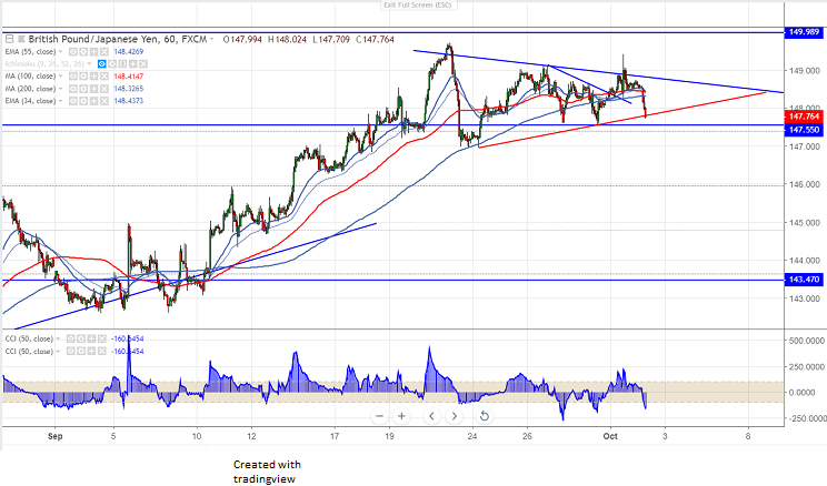 The pair has shown a minor decline below trend line support and any hourly close below 147.80 confirms further weakness. Any close below 147.80 targets 147.50/146.95.