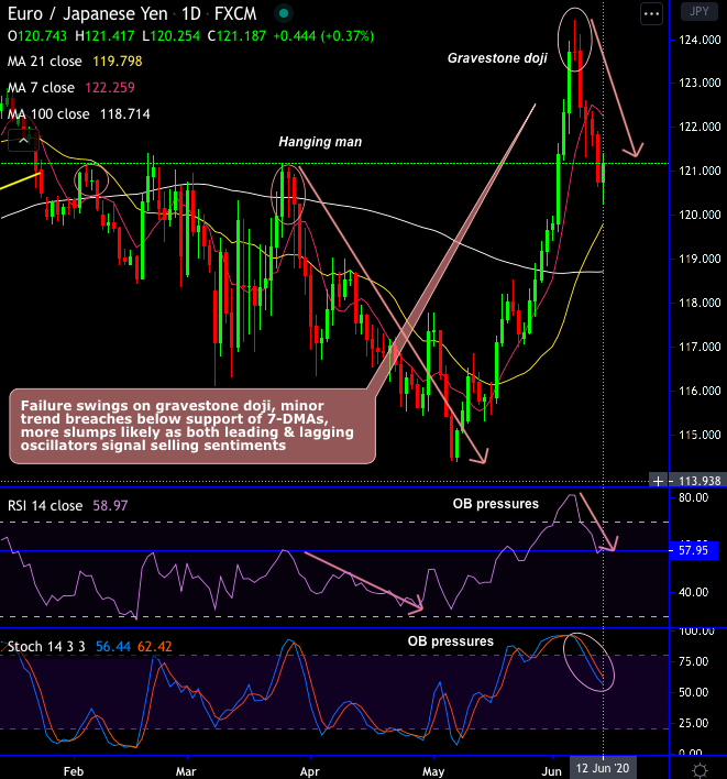 EURJPY bears have been constantly nudging prices below DMAs amid the highly volatile trading sessions of late. Gravestone doji pops-up at 123.703 levels, ever since then, the pair shows failure swings upon this bearish doji pattern, and it has been plummeting from the highs of 124.120 levels to the recent lows of 120.254 levels.