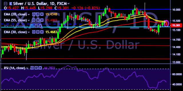 We prefer to take short position on XAG/USD around $15.34, stop loss at $15.47 and target of $15.22/$15.07.