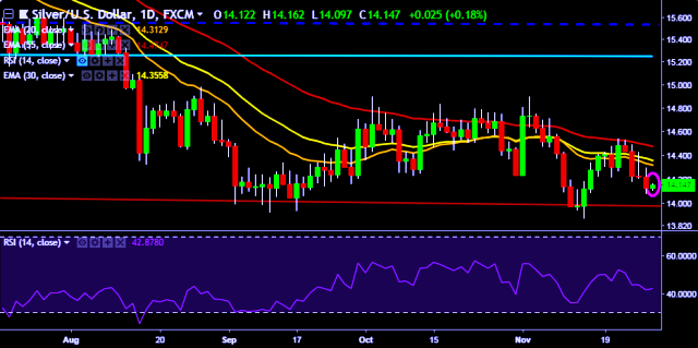 We prefer to take long position on XAG/USD only above $14.16, stop loss $14.07 and target of $14.30.