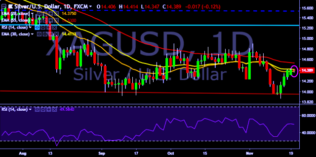 We prefer to take long position on XAG/USD only above $14.42, stop loss $14.27 and target of $14.57.
