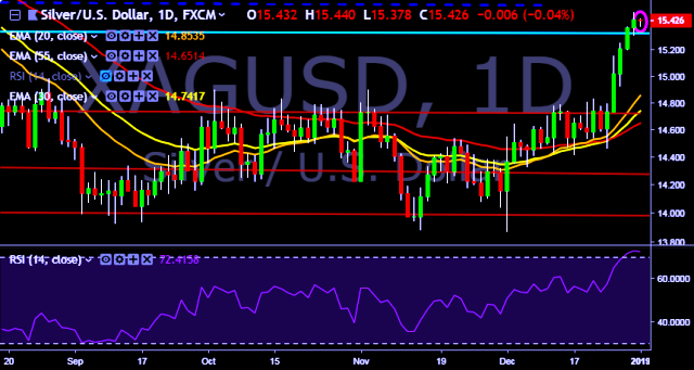 We prefer to take long position on XAG/USD around $15.40, stop loss $15.27 and target of $15.58.