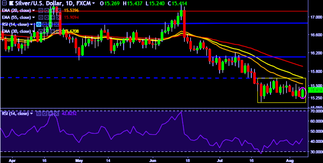 We prefer to take long position on XAG/USD around $15.38, stop loss $15.22 and target of $15.85.