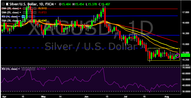 We prefer to take short position on XAG/USD around $15.40, stop loss $15.50 and target of $15.22.