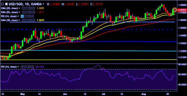 We prefer to take long position on USD/SGD around 1.3715, stop loss at 1.3692 and target of 1.3775.