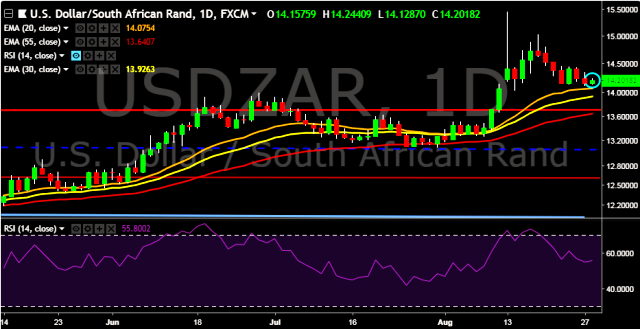 We prefer to take short position on USD/ZAR only below 14.10, stop loss at 14.28 and target of 13.90.