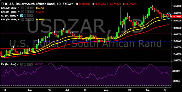 We prefer to take short position on USD/ZAR around 14.80, stop loss at 14.92 and target of 14.59/14.30.
