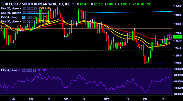 We prefer to take long position on EUR/KRW around 1,285, stop loss at 1,276 and target of 1,294/1,300.