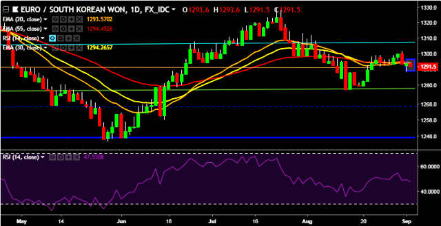 We prefer to take short position on EUR/KRW around 1,292, stop loss at 1,301 and target of 1,277.