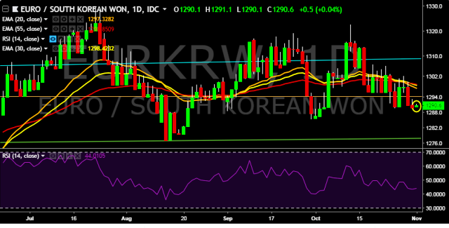 We prefer to take short position on EUR/KRW only below 1,289, stop loss at 1,302 and target of 1,277/1,267.
