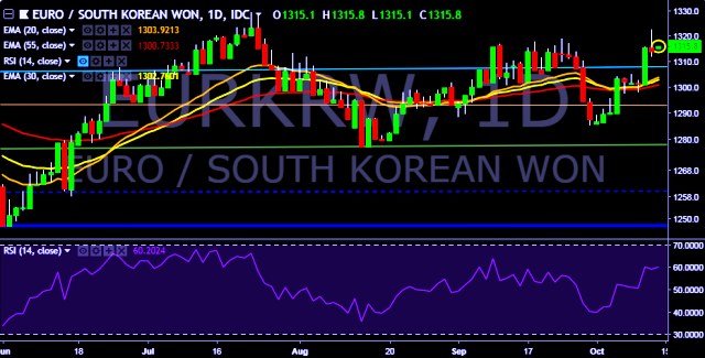 We prefer to take long position on EUR/KRW around 1,313, stop loss at 1,307 and target of 1,327.