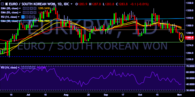 We prefer to take short position on EUR/KRW around 1,285, stop loss at 1,302 and target of 1,267.