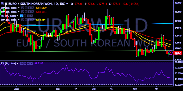 We prefer to take short position on EUR/KRW around 1,277, stop loss at 1,282 and target of 1,258.
