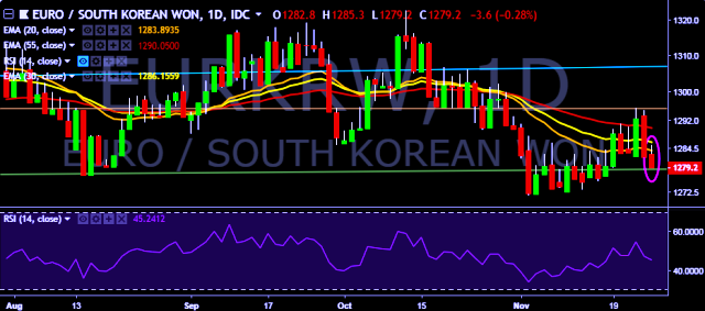 We prefer to take short position on EUR/KRW around 1,280, stop loss at 1,295 and target of 1,258.