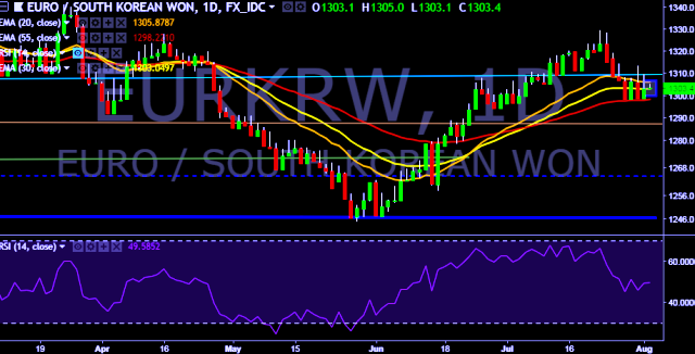 We prefer to take long position on EUR/KRW only above 1,308, stop loss at 1,298 and target of 1,327.