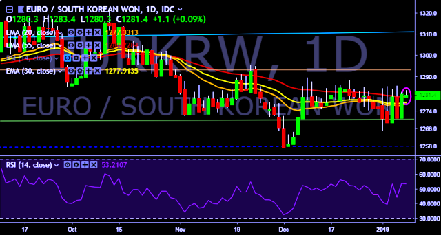 We prefer to take long position on EUR/KRW only above 1,290, stop loss at 1,268 and target of 1,307.
