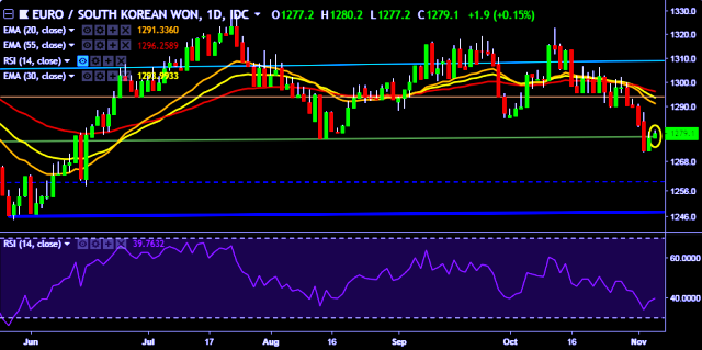We prefer to take short position on EUR/KRW only below 1,277, stop loss at 1,288 and target of 1,270/1,258/1,246.
