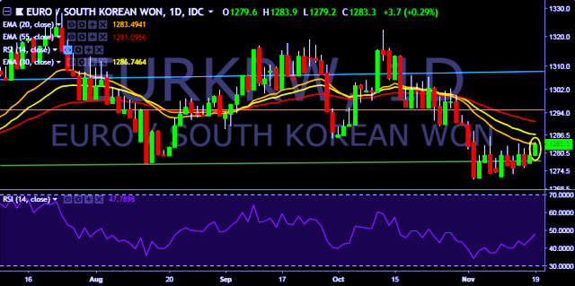 We prefer to take long position on EUR/KRW around 1,280, stop loss at 1,272 and target of 1,295.