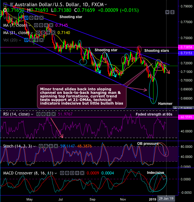 Technical glance: AUDUSD minor trend slides back in the sloping channel after the occurrences of bearish pattern candlesticks, like, shooting star, hanging man & spinning top at channel resistance.
