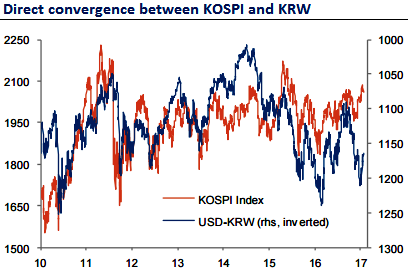 They are linked via risk sentiment and rarely diverge for too long. Based on where the KOSPI is trading, USDKRW should be closer to 1120.