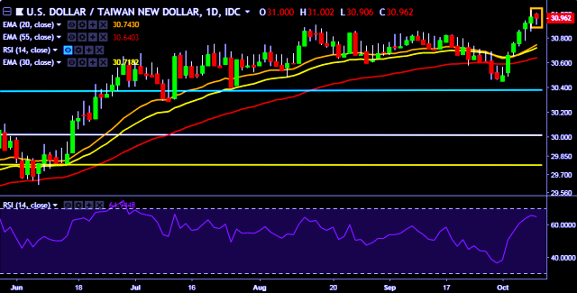 We prefer to take long position on USD/TWD only above 31.00, stop loss at 30.70 and target of 31.42.