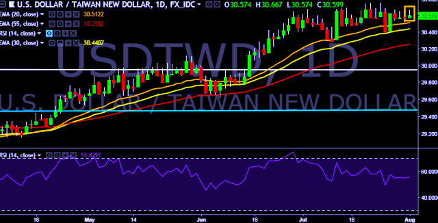 We prefer to take long position on USD/TWD only above 30.70, stop loss at 30.40 and target of 30.90/31.17.